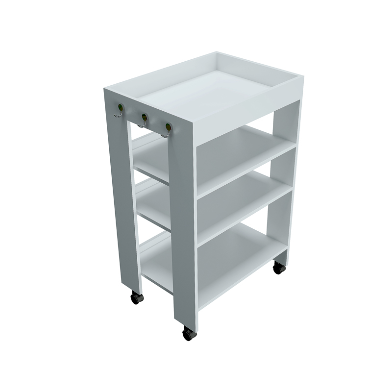 Este módulo para facilitar la sanitización y evitar esparcir contaminaciones le ayuda a protejerse al llegar a su casa u oficina. La parte superior del módulo incluye un espacio para artículos de sanitización y recipiente de desechos, así como 6 colgadores para llaves, mascarillas, etc. La parte inferior cuenta con 1 bandeja con alfombra para desinfección de zapatos y 3 entrepaños con bandejas para secado de zapatos. Los rodos permiten una movilidad fácil.
